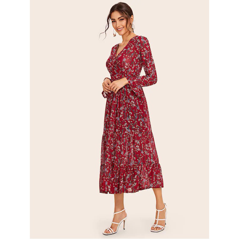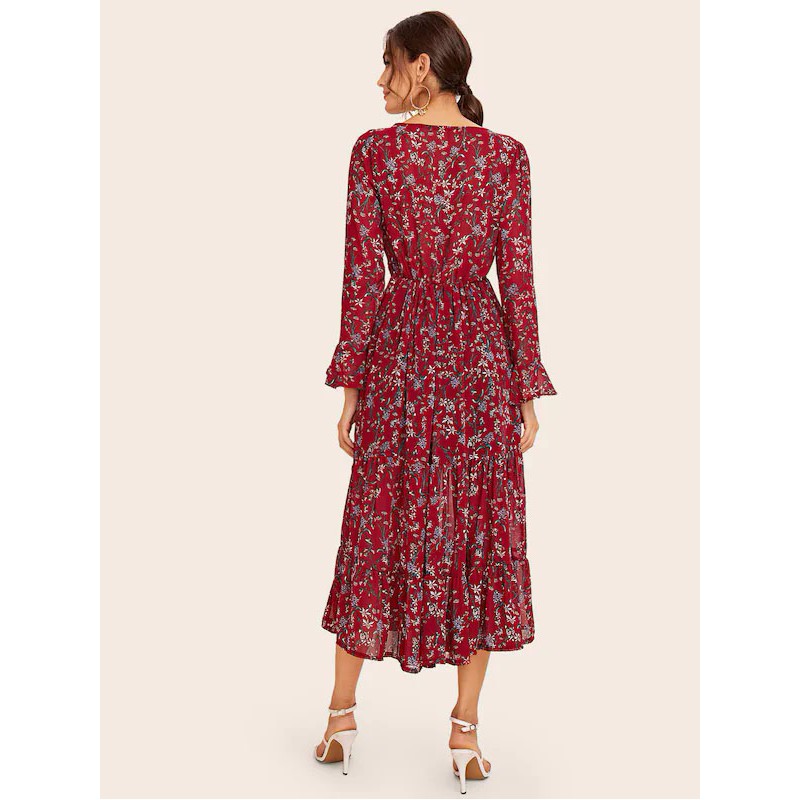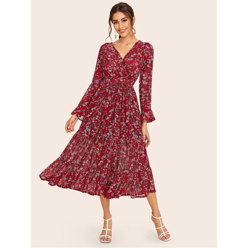 Vestido Volante Rígido Ditsy Floral Burdeos Casual