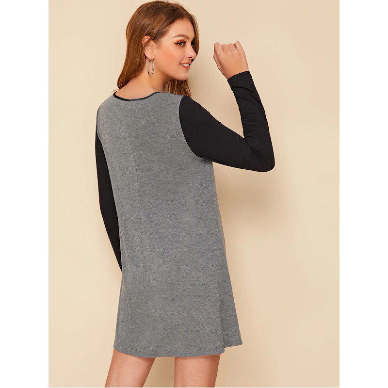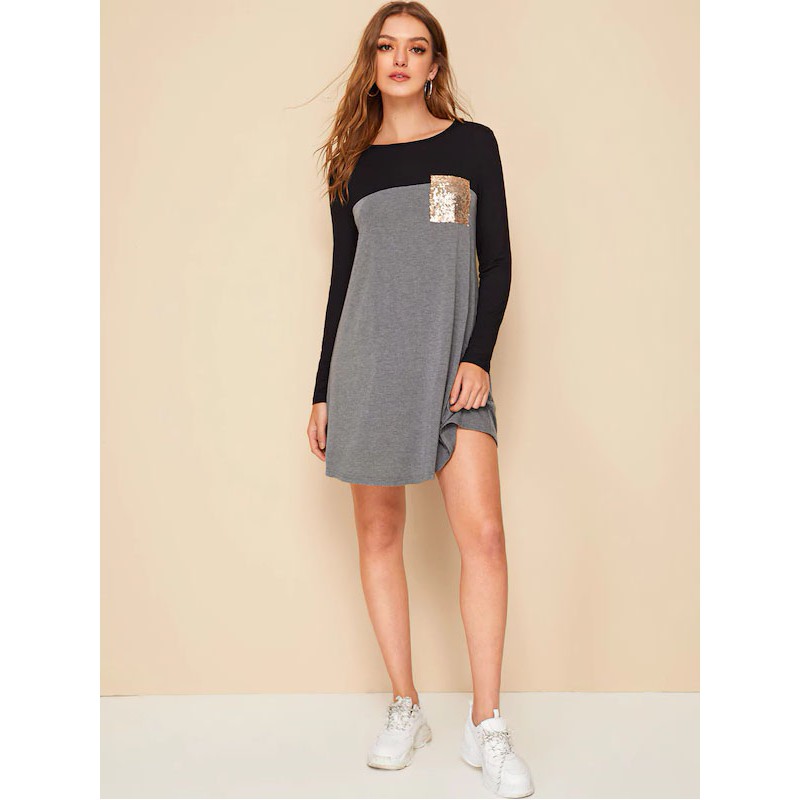 Vestido Estilo Camiseta De Color Combinado Con Bolsillo Con Lentejuelas En Contraste